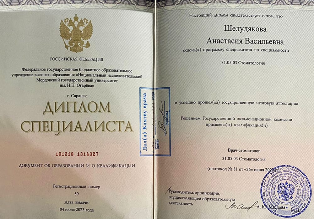 2025 г. - Окончила ФГБОУ ВО «Национальный исследовательский Мордовский государственный университет им. Н.П. Огарёва» по специальности «Стоматология терапевтическая».
