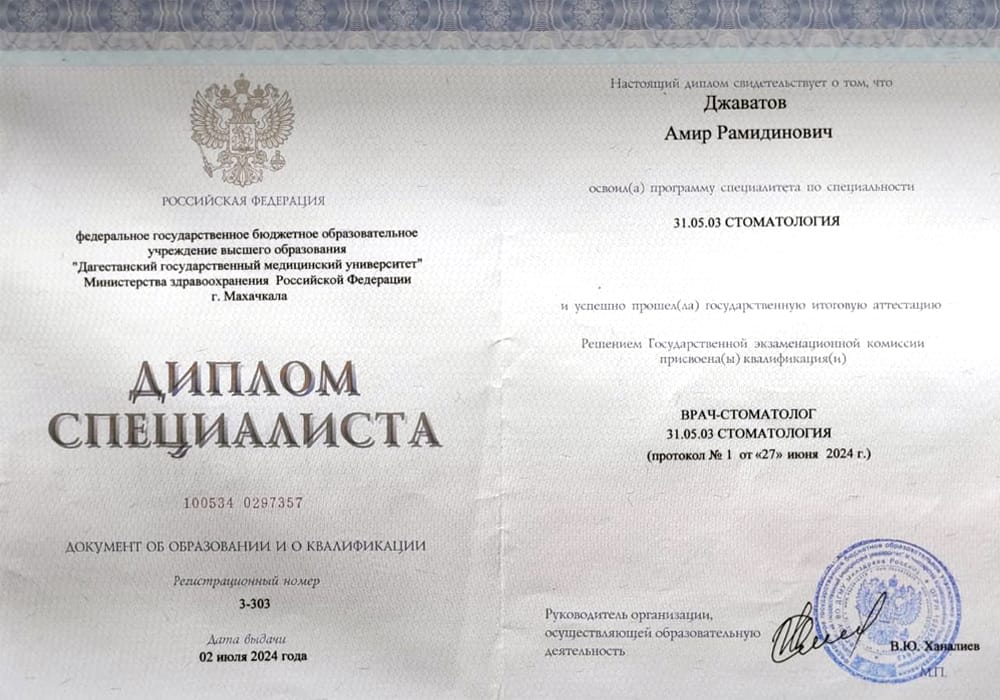 2024 г.- Окончил Дагестанский Государственный Медицинский Университет по специальности "Стоматология".