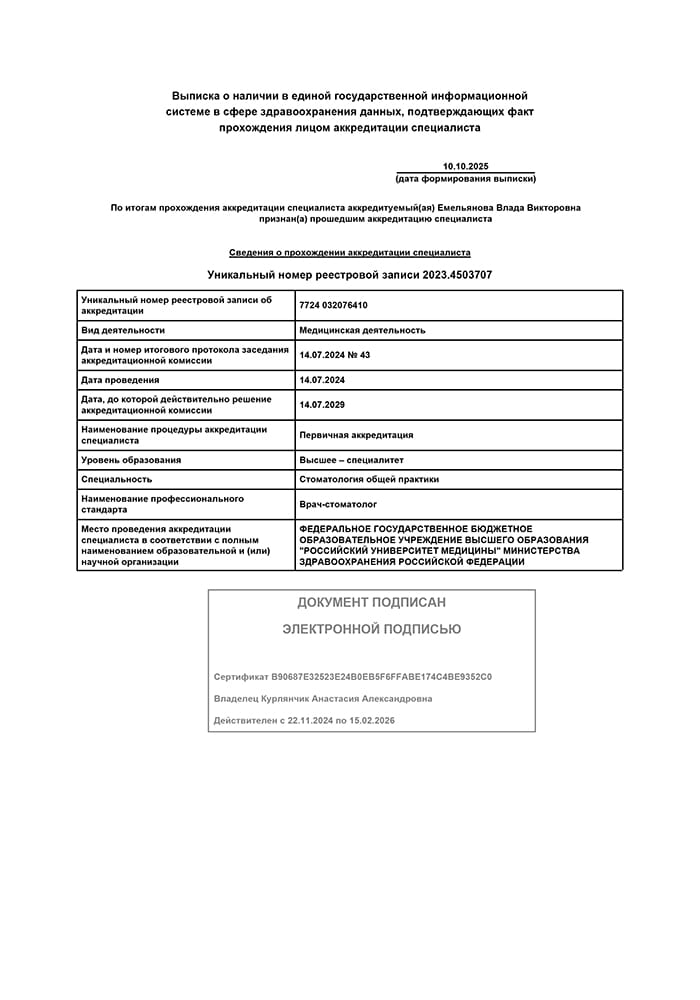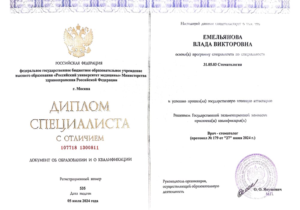 2024 г.- Московский государственный медико‑стоматологический университет имени А.И. Евдокимова, Москва. Стоматологический факультет, Стоматология (врач)