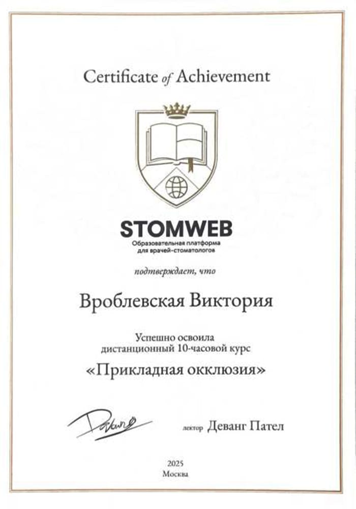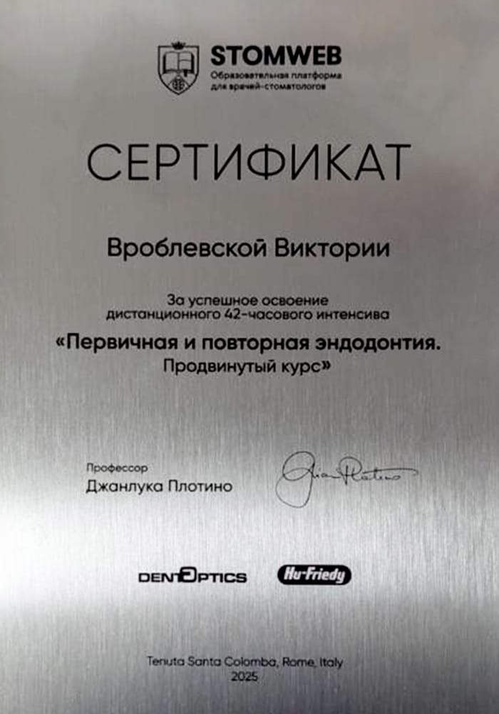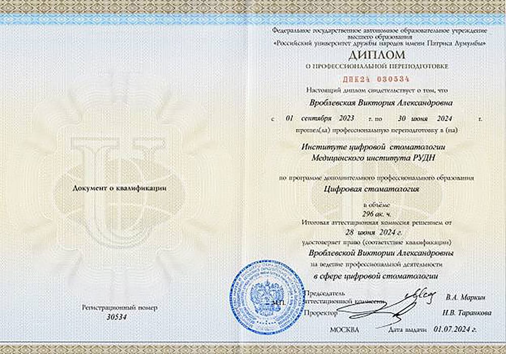 2024 г.- Профессиональная переподготовка в Российском университете дружбы народов имени Патриса Лумумбы по программе дополнительного профессионального образования «Цифровая стоматология»