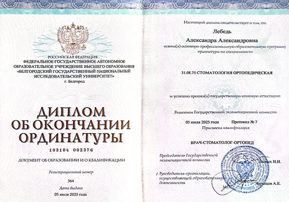 2025 г. - Ординатура в Белгородском Государственном Университете по специальности «Стоматология ортопедическая»