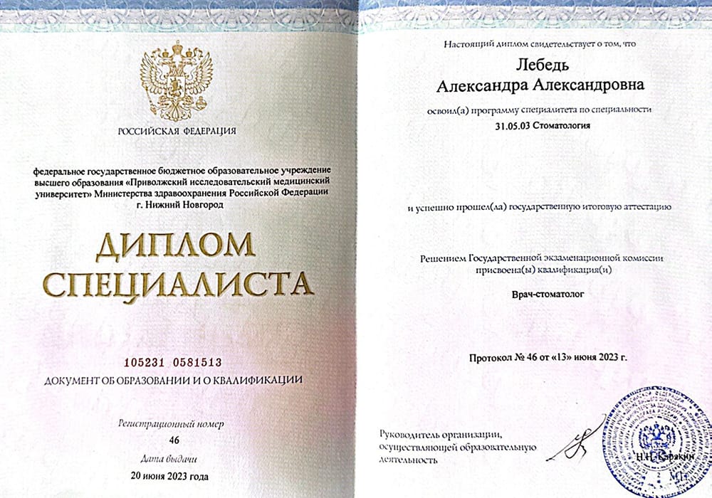 2023 г. - окончила Приволжский Исследовательский Медицинский Университет по специальности «Стоматология»