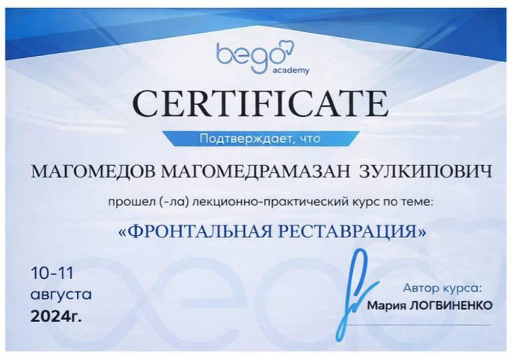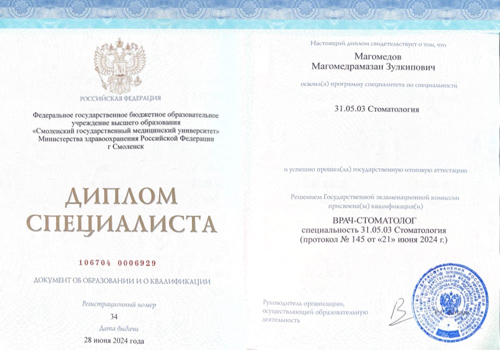 2024 г.- Смоленский государственный медицинский иуниверситет , Смоленск, Врач стоматолог.