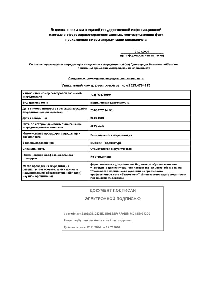 2025 г. - Повышение квалификации в Российской медицинской академии непрерывного профессионального образования по специальности «Стоматология хирургическая».