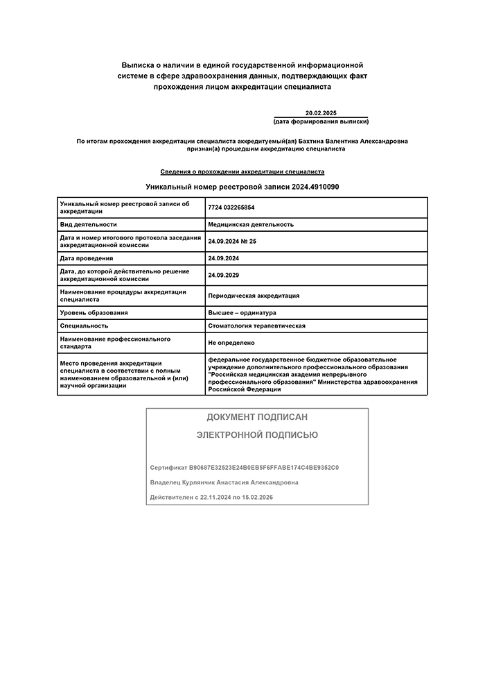 2024 г. - Повышение квалификации в Российской медицинской академии непрерывного профессионального образования по специальности «Стоматология терапевтическая».