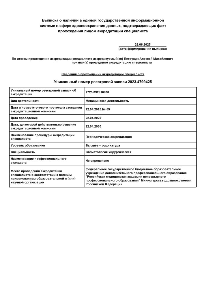 2025 г. - Повышение квалификации в Московском областном научно-исследовательском клиническом институте им.М.Ф.Владимирского по специальности «Стоматология хирургическая».