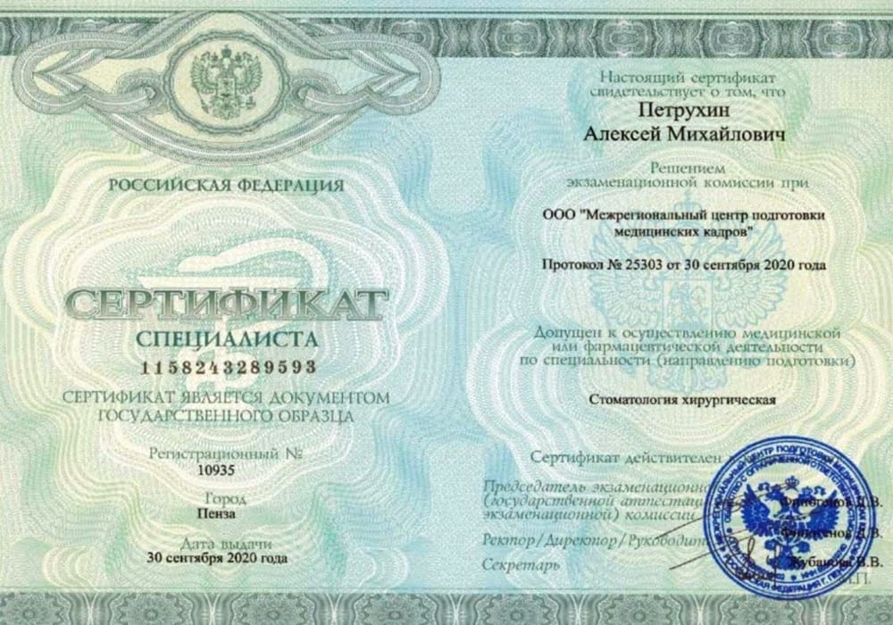 2021 г. - Повышение квалификации в Московском областном научно-исследовательском клиническом институте им.М.Ф.Владимирского по специальности «Стоматология хирургическая».