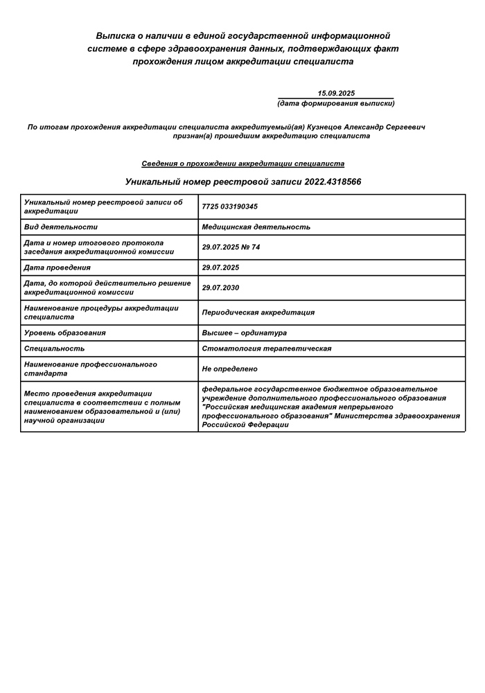 2025 г. - Повышение квалификации в Российской медицинской академии непрерывного профессионального образования по специальности «Стоматология терапевтическая».