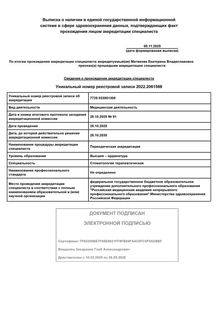 2020 г. - Повышение квалификации в Центре специализированного образования «Проф-Ресурс» по специальности «Стоматология терапевтическая».