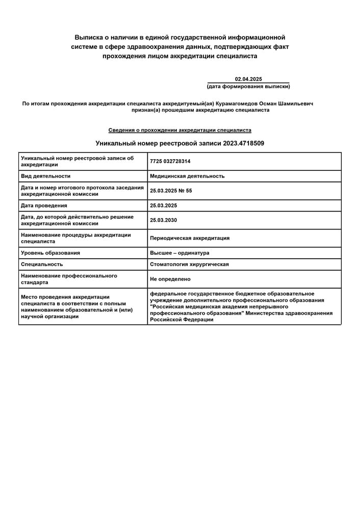 2025 г. - Повышение квалификации в Российской медицинской академии непрерывного профессионального образования по специальности «Стоматология хирургическая».