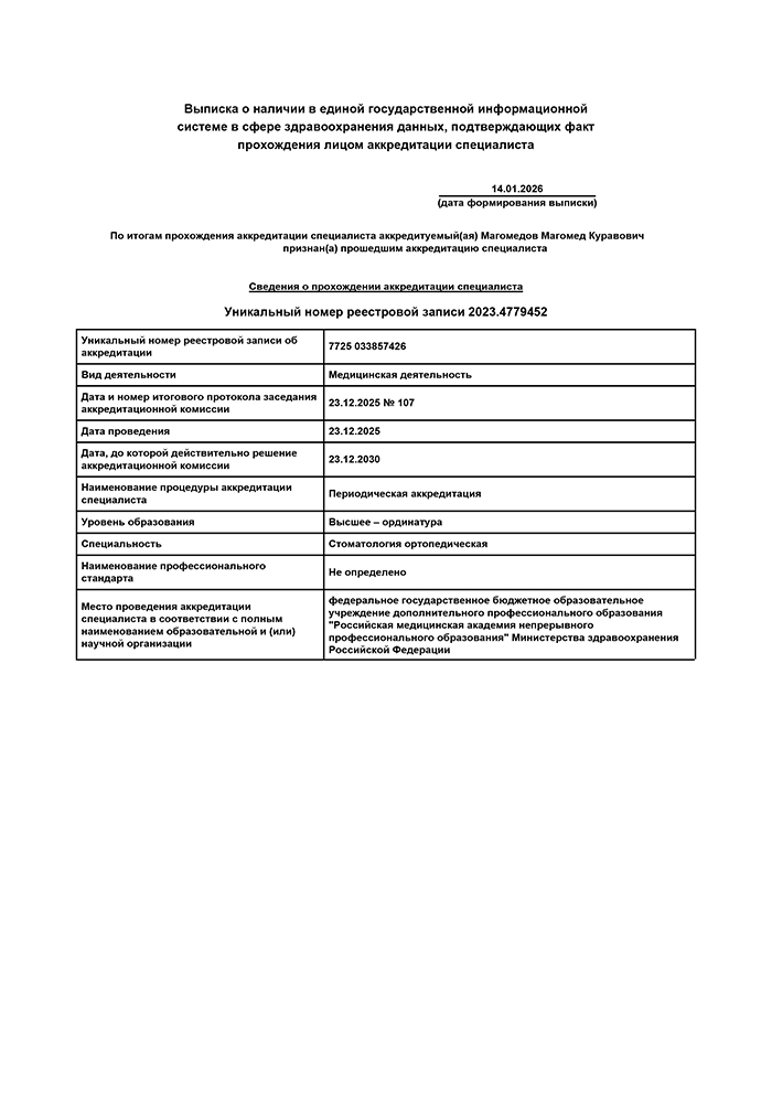 2025 г. - Повышение квалификации в Российской медицинской академии непрерывного профессионального образования по специальности «Стоматология ортопедическая».