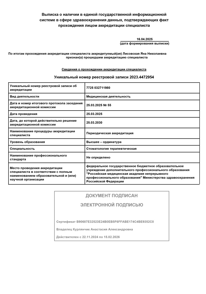 2004 - 2005 гг. - Прошла обучение по общей стоматологии на кафедре постдипломного образования.