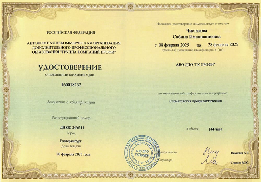 2025 г. - Повышение квалификации в Группе компаний «Профи» по специальности «Стоматология профилактическая».