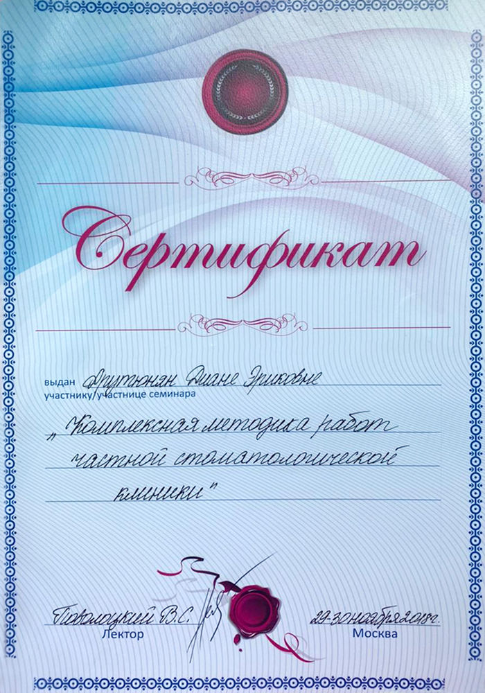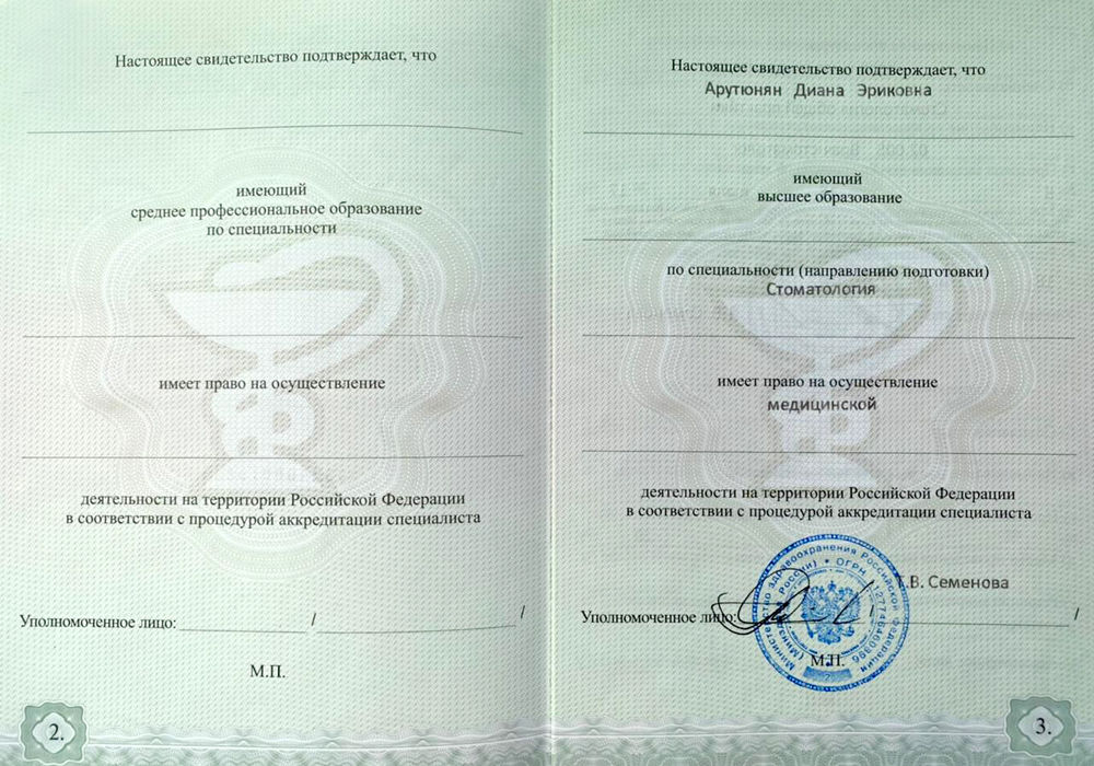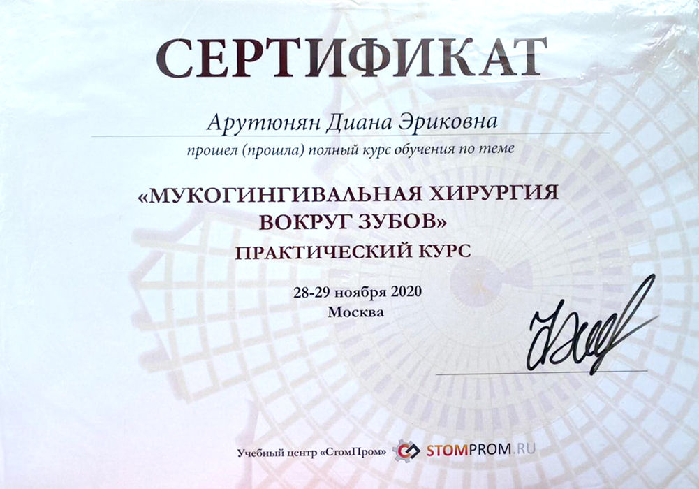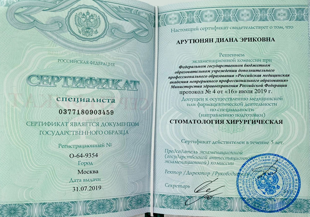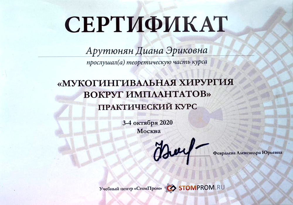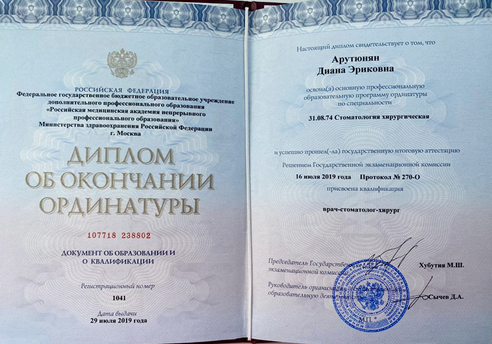2019 г. - Ординатура в Российской медицинской академии непрерывного профессионального образования по специальности «Стоматология хирургическая».