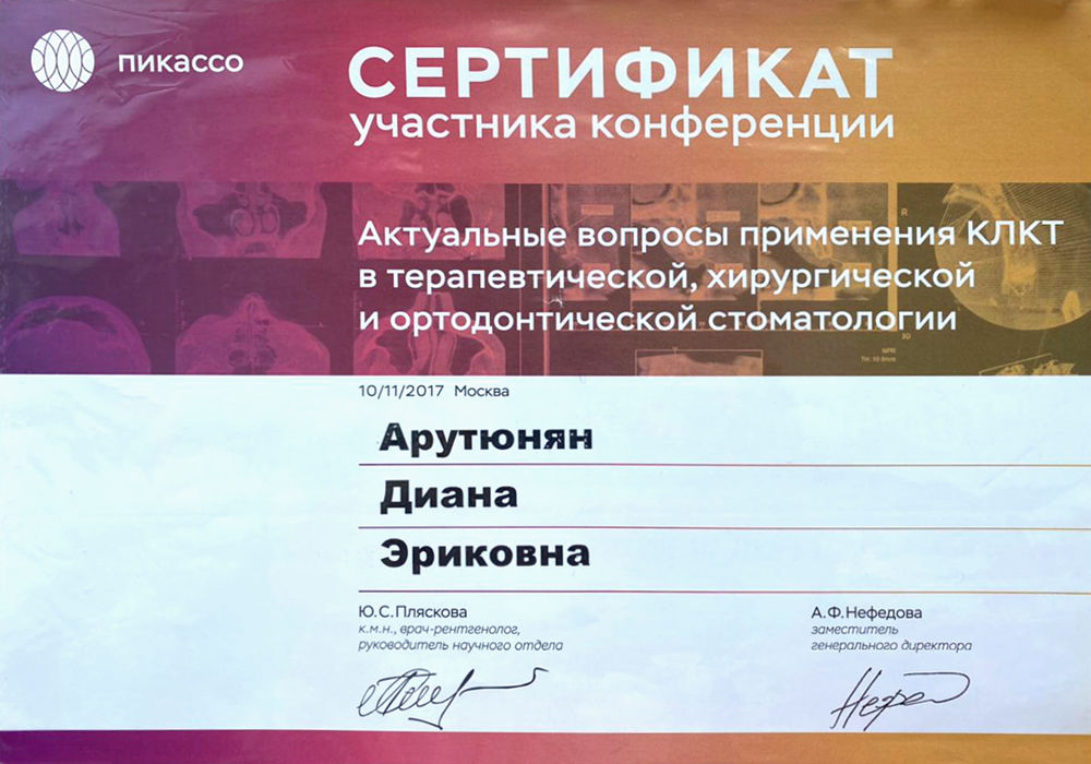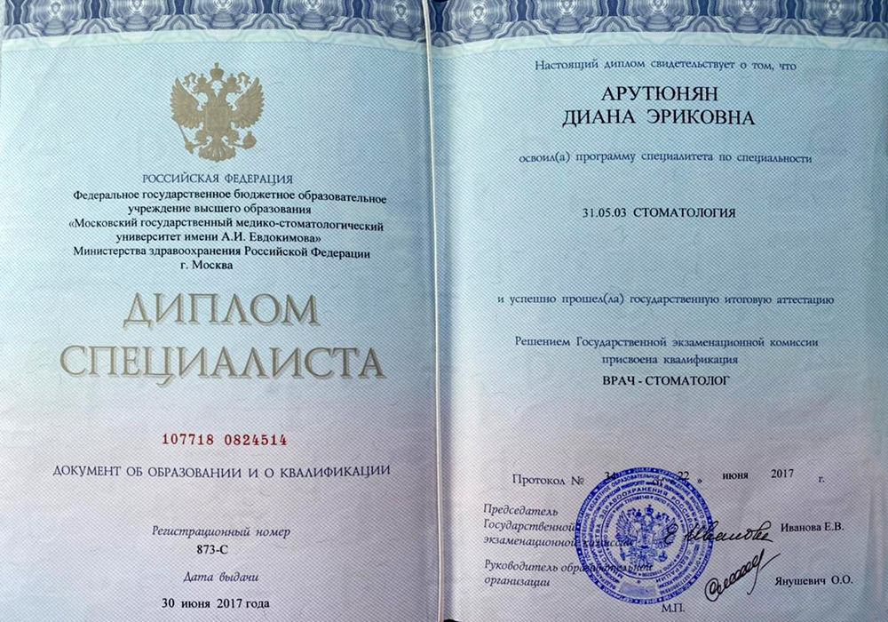 2017 г. - Окончил Московский государственный медико-стоматологический университет им. А.И. Евдокимова по специальности «Стоматология».