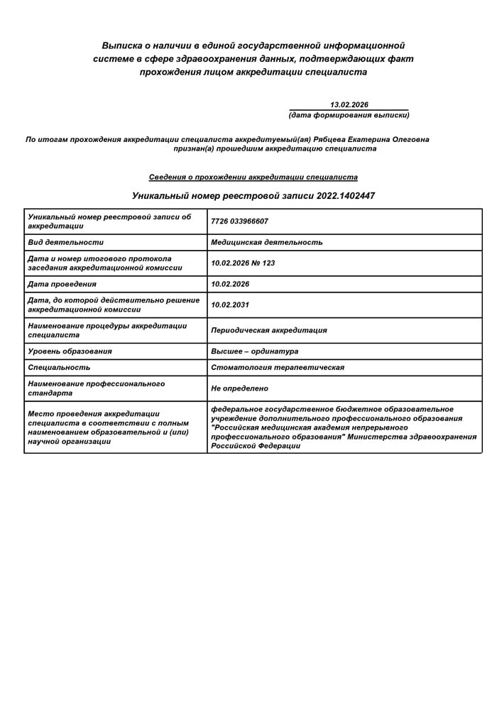 2020 г. - Профессиональная переподготовка в Межрегиональном центре подготовки медицинских кадров по специальности «Стоматология терапевтическая».