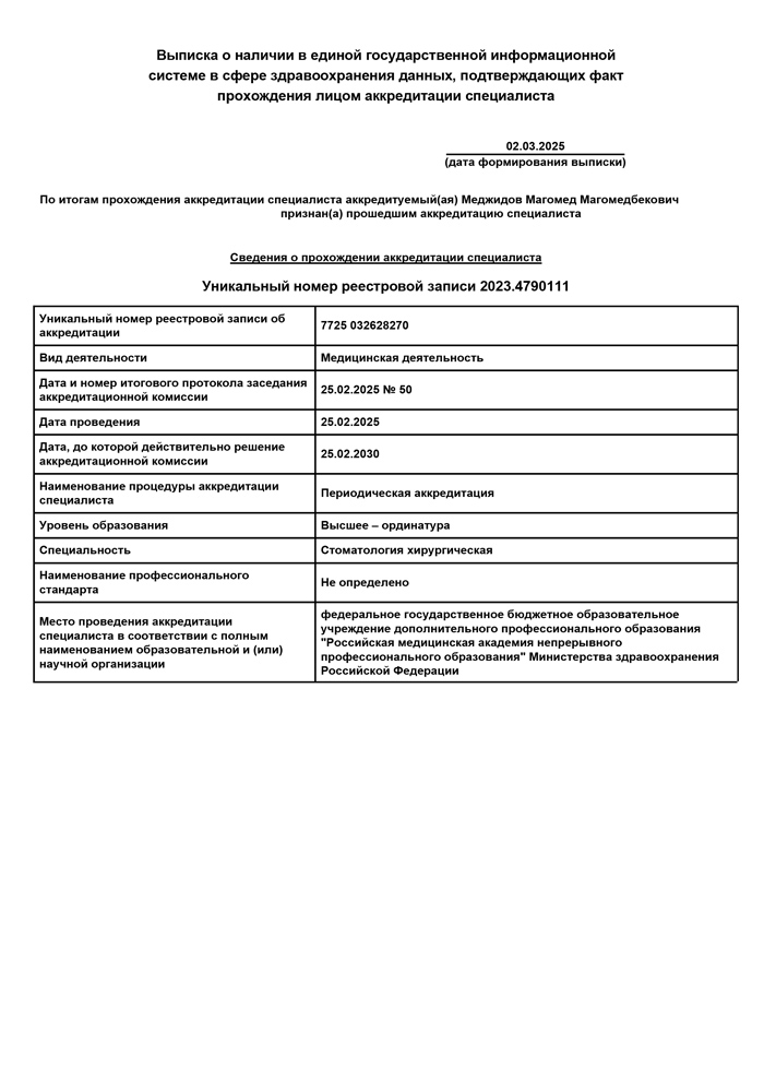 2007 г. - Интернатура на Кафедре общей практики Дагестанской государственной медицинской академии по специальности «Стоматология».