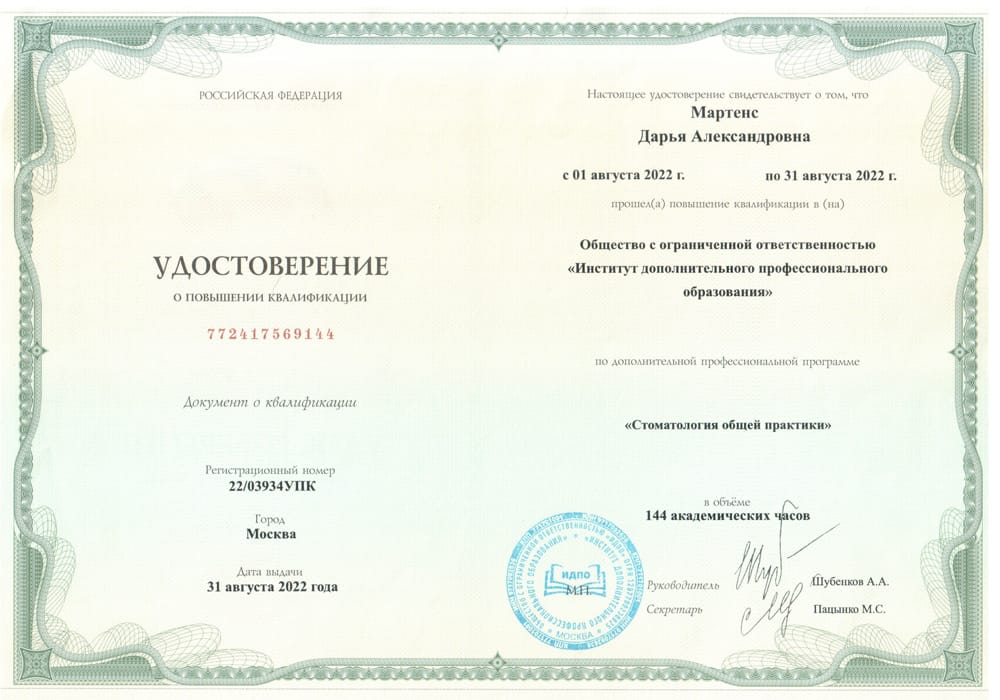 2022 г. – Повышение квалификации в Институте Дополнительного Профессионального Образования по специальности «Стоматология общей практики»