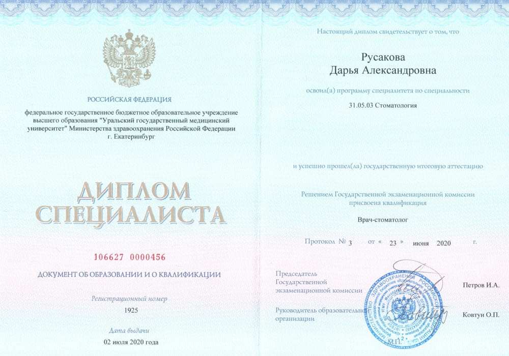 2020 г. – Окончила Уральский Государственный Медицинский Университет по специальности «Стоматология»