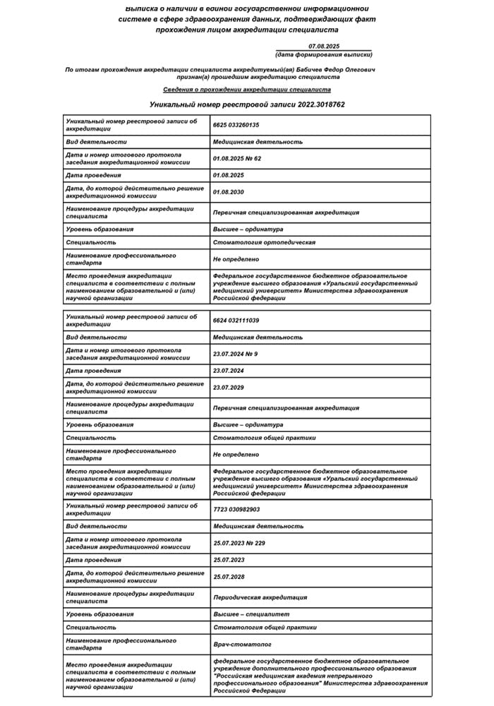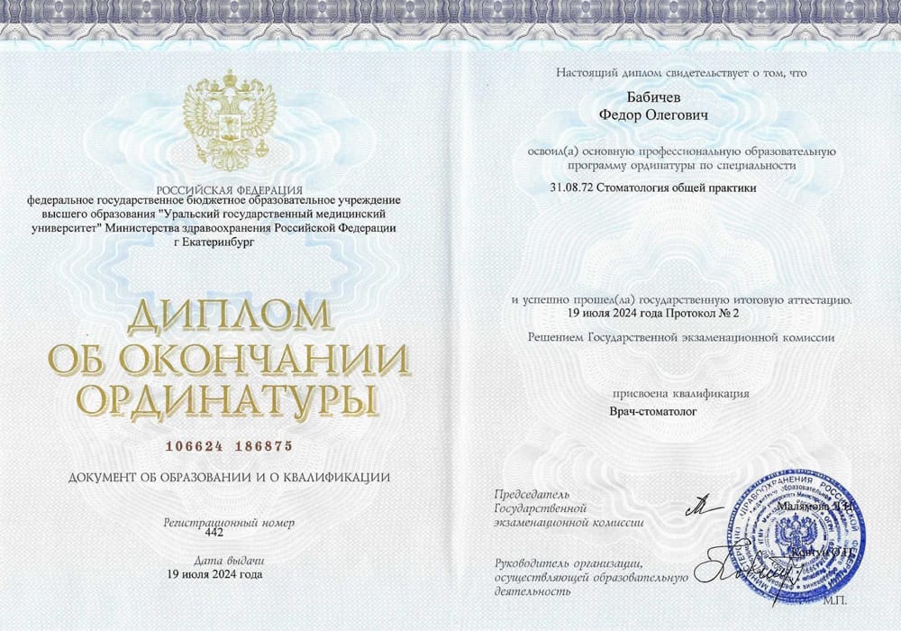 2024 г. – ординатура в Уральском Государственном Медицинском Университете по специальности «Стоматология общей практики»