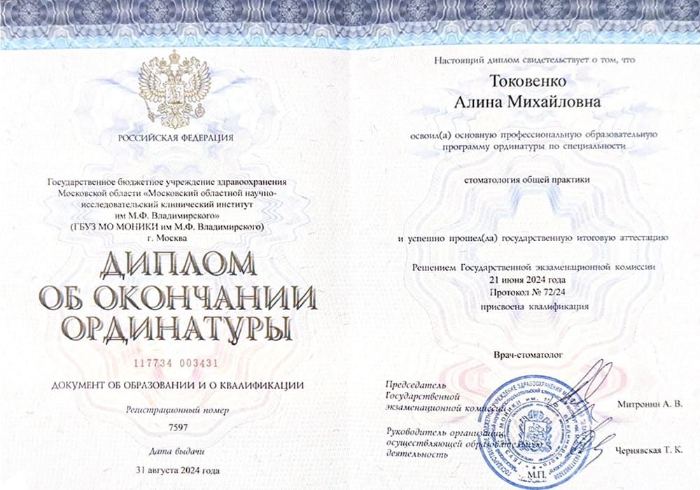 2024 г. - Ординатура в Московском областном научно-исследовательском клиническом институте по специальности «Стоматология общей практики».