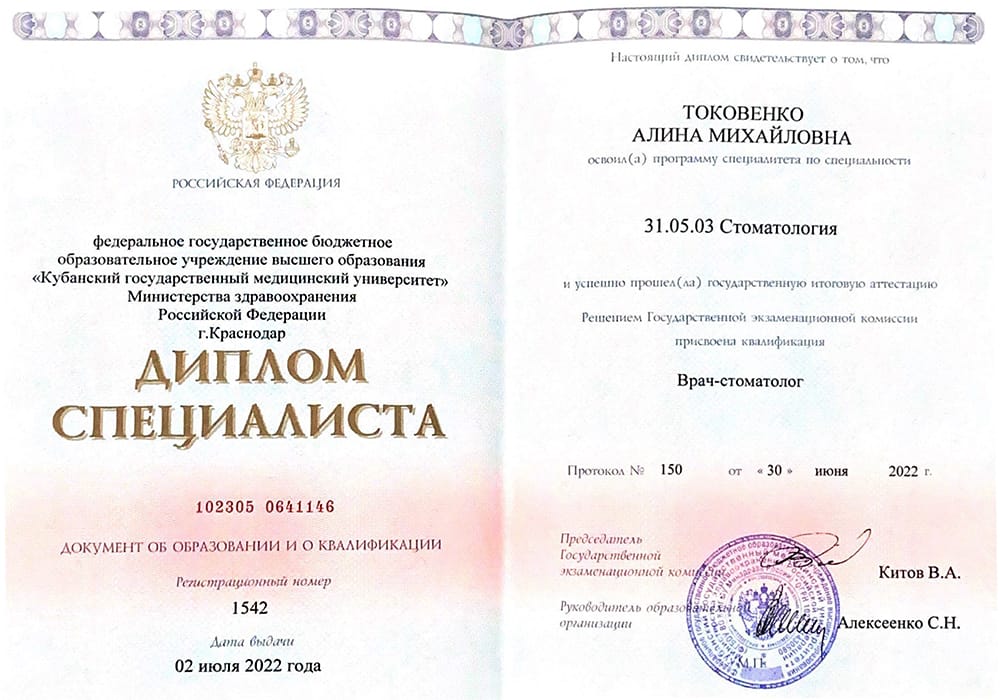 2022 г. - Окончила Кубанский государственный медицинский университет по специальности «Стоматология».