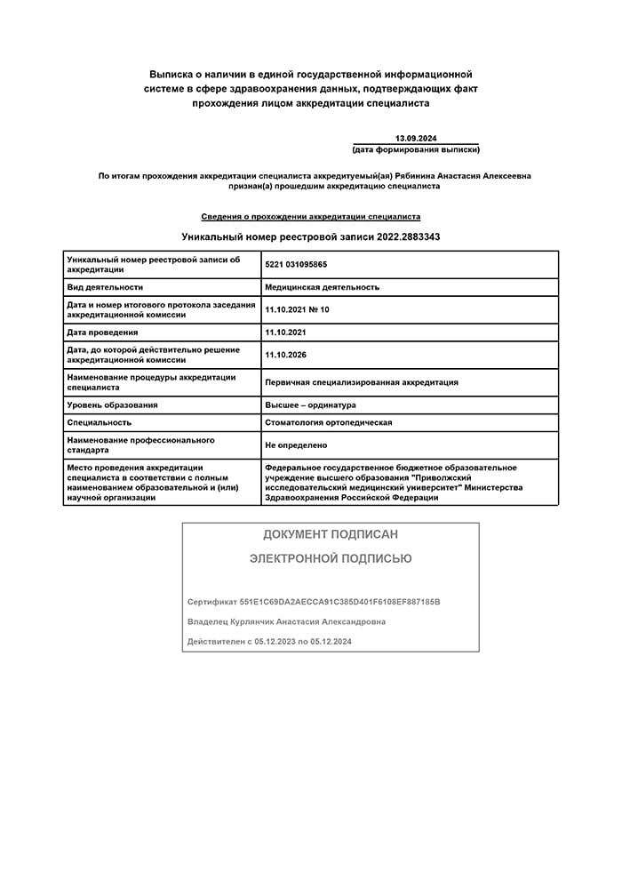 2021 г. - Профессиональная переподготовка в Приволжском исследовательском медицинском университете по специальности «Стоматология ортопедическая».