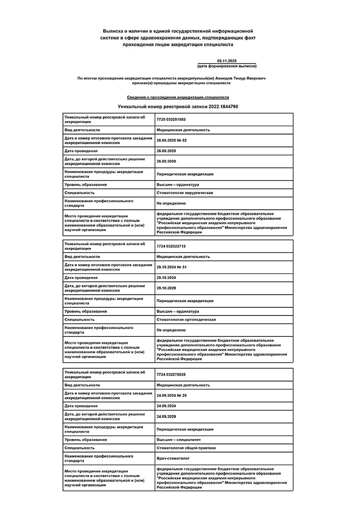 2017 г. – Первичная аккредитация специалиста. Присвоена специальность: «Стоматология общей практики».