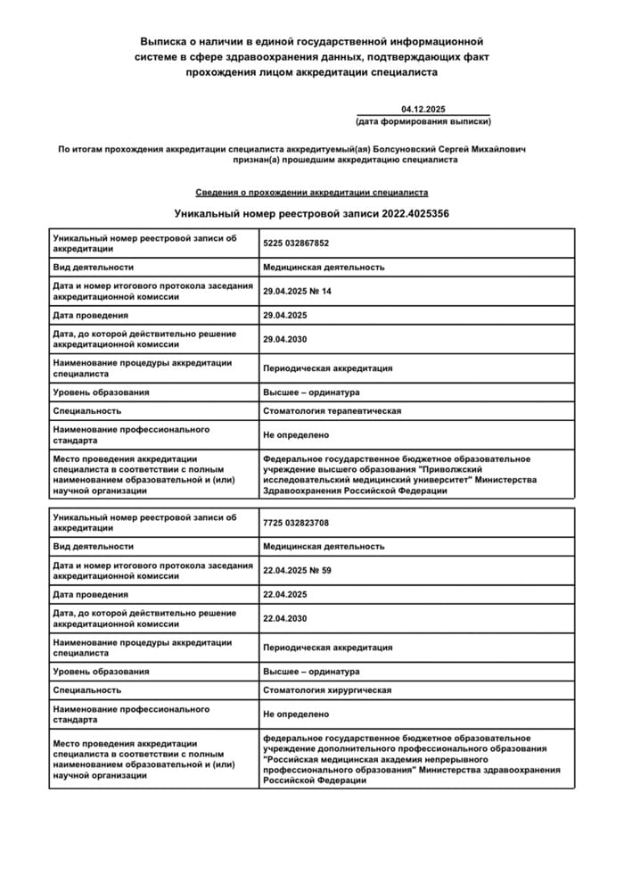 2025 г. - Повышение квалификации в Российской медицинской академии непрерывного профессионального образования по специальности «Стоматология хирургическая».