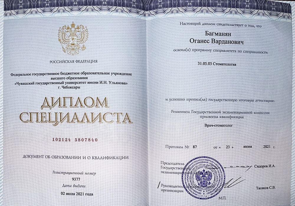 2021 г. — Чувашский государственный университет им. И.Н. Ульянова по специальности «Стоматология».