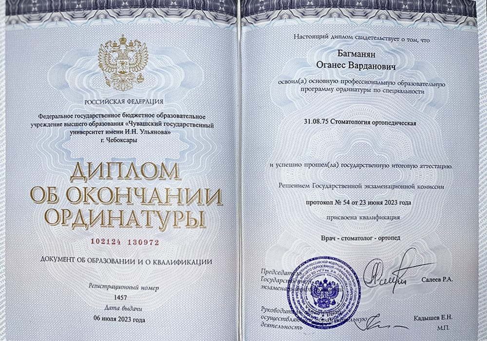 2023 г. — Чувашский государственный университет им. И.Н. Ульянова по специальности «Стоматология ортопедическая».