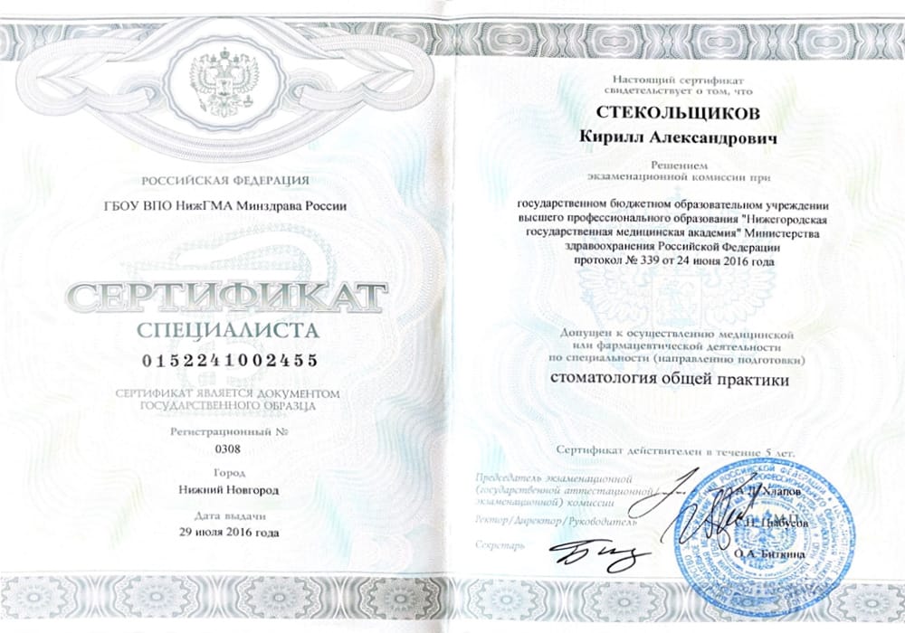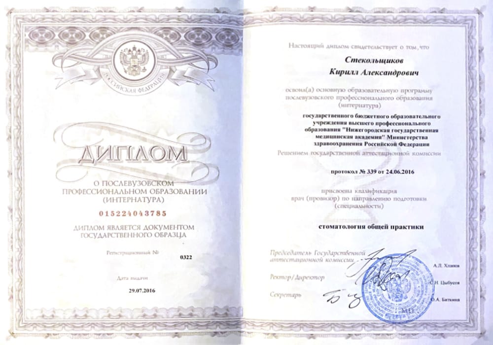 2016 г.- Интернатура- Государственное бюджетное образовательное учреждение высшего профессионального образования «Нижегородская государственная медицинская академия» Министерства здравоохранения Российской Федерации./ Врач стоматолог общей практики.