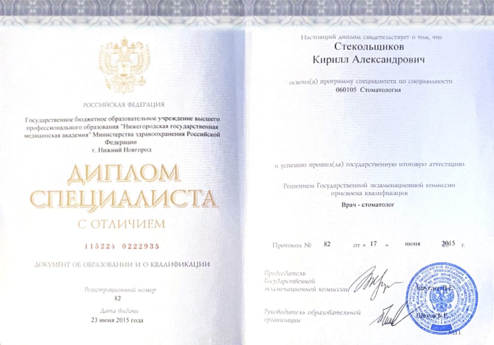 2015 г.- Государственное бюджетное образовательное учреждение высшего профессионального образования «Нижегородская государственная медицинская академия» Министерства здравоохранения Российской Федерации./ Врач стоматолог. (Диплом специалиста с отличием). Специалитет по специальности «Стоматология».