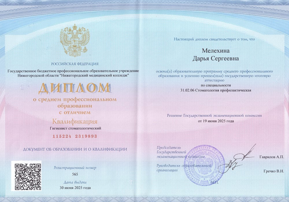 2025 г.- Нижегородский медицинский колледж по специальности « Стоматология профилактическая».