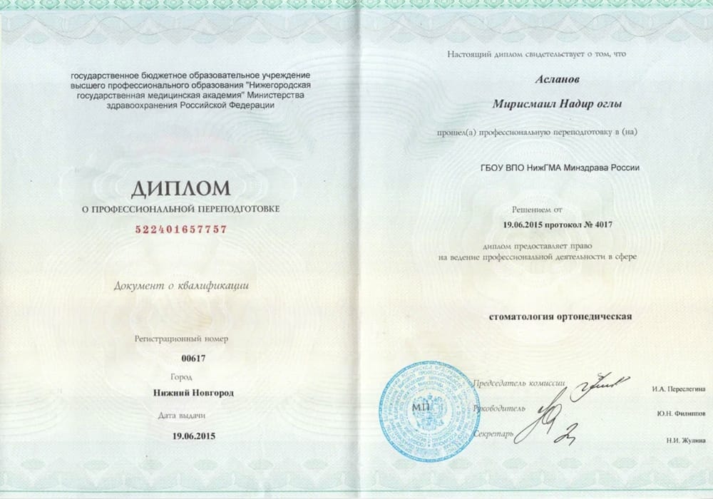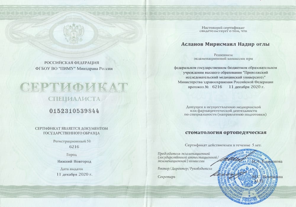 2015 г.- закончил ординатуру по специальности « Ортопедическая Стоматология».