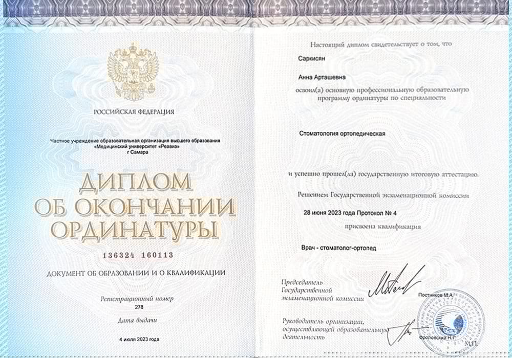 2023 г.- Ординатура в Медицинском университете «Реавиз» по специальности «Стоматология ортопедическая».