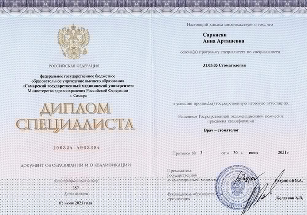 2021г.- окончила Самарский государственный медицинский университет по специальности «Стоматология».