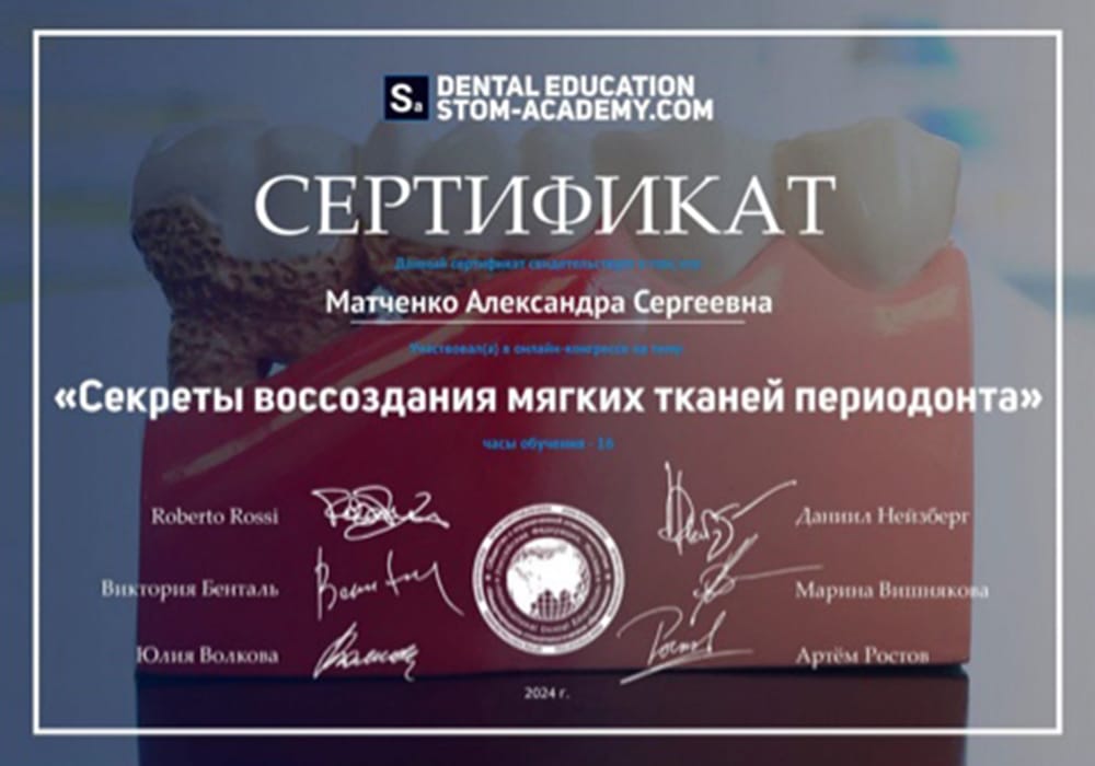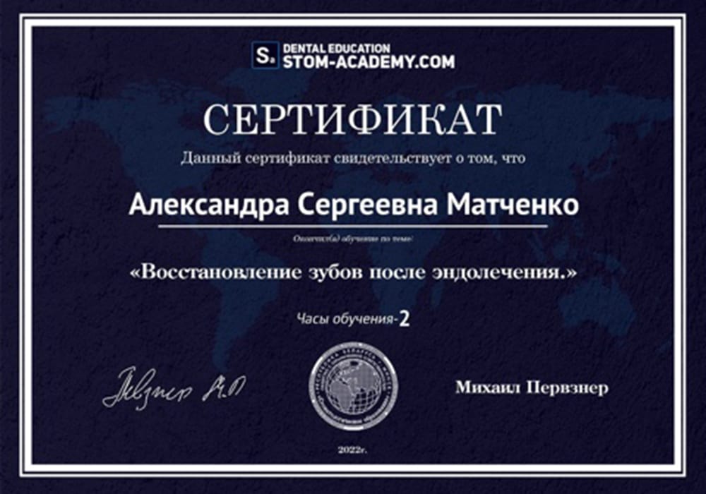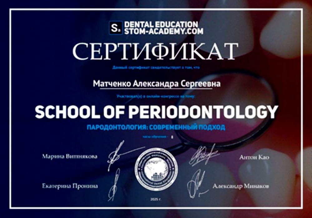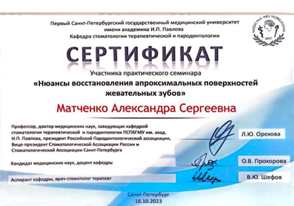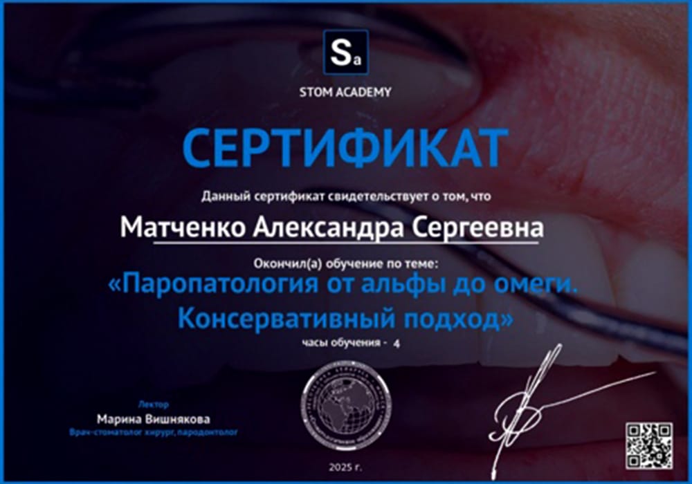 2025 г. - окончила ординатуру на базе Санкт-Петербургского государственного медицинского университета им.акад.И.П. Павлова по специальности «Стоматология терапевтическая».