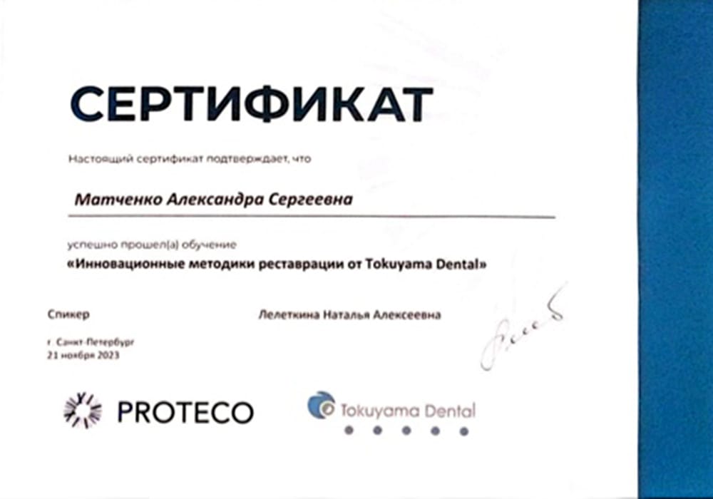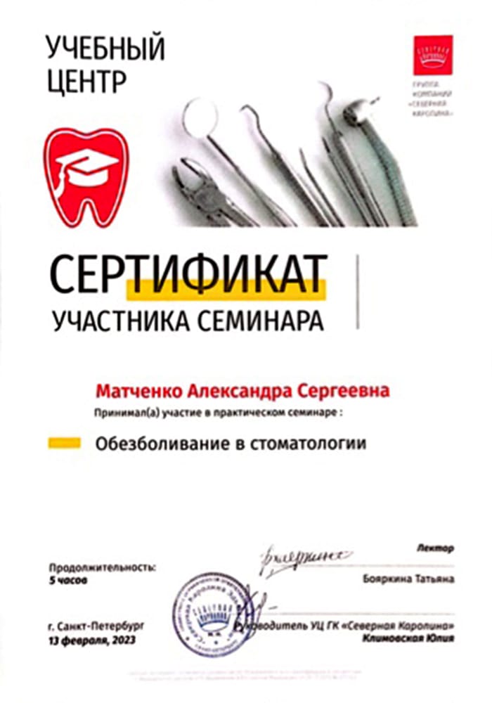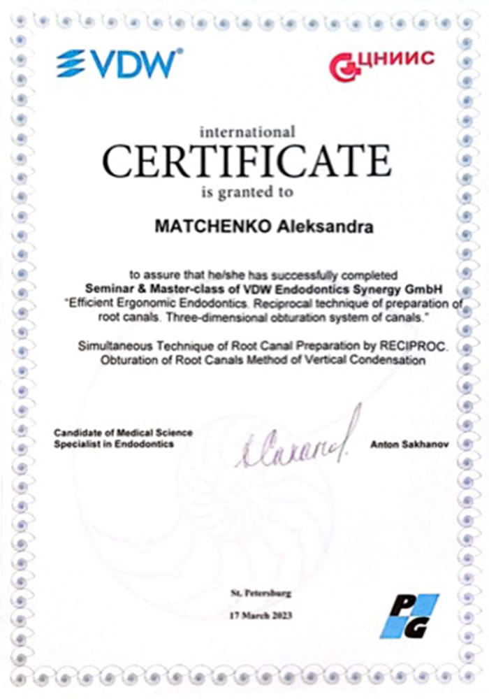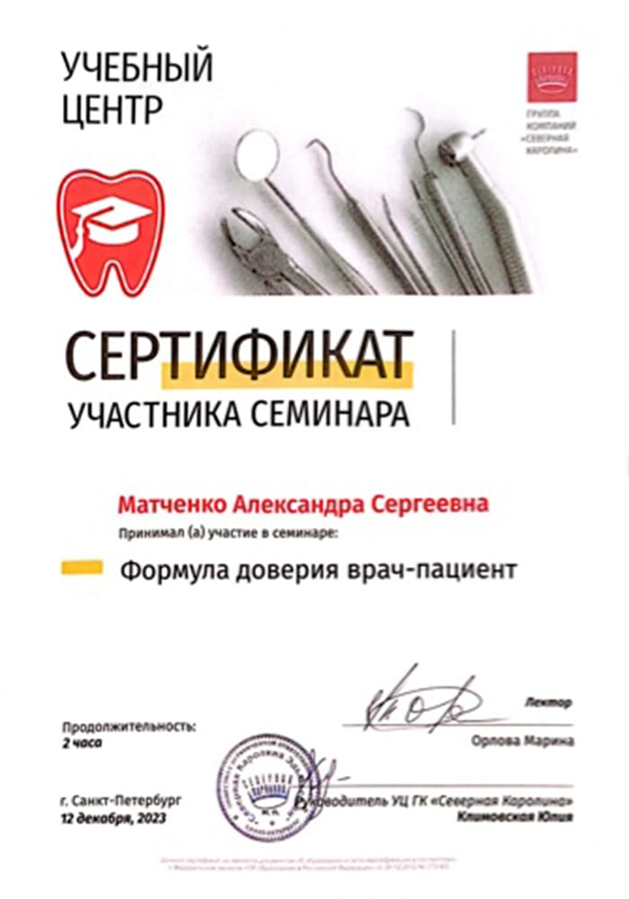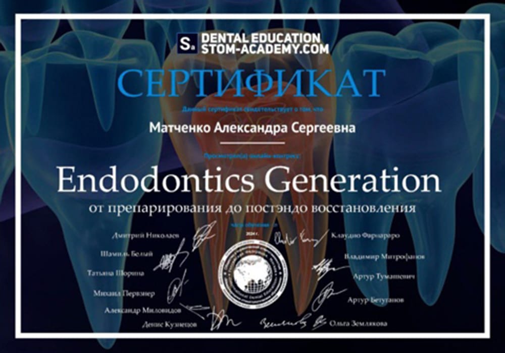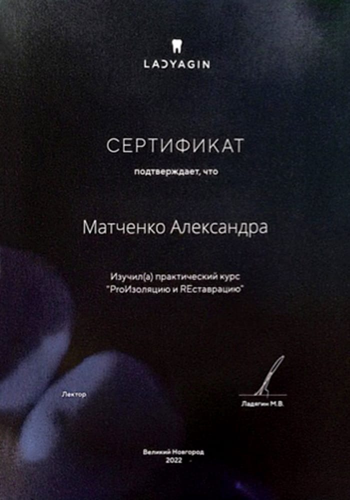 2025 г. - окончила ординатуру на базе Санкт-Петербургского государственного медицинского университета им.акад.И.П. Павлова по специальности «Стоматология терапевтическая».
