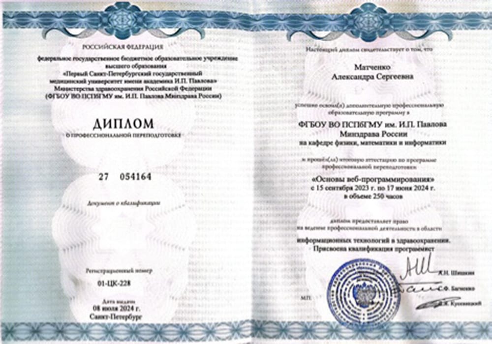 2024 г. - профессиональная переподготовка в Санкт-Петербургском государственном медицинском университете им.акад.И.П. Павлова по направлению "Основы веб-программирования в медицине".