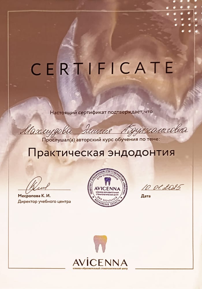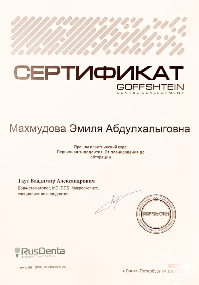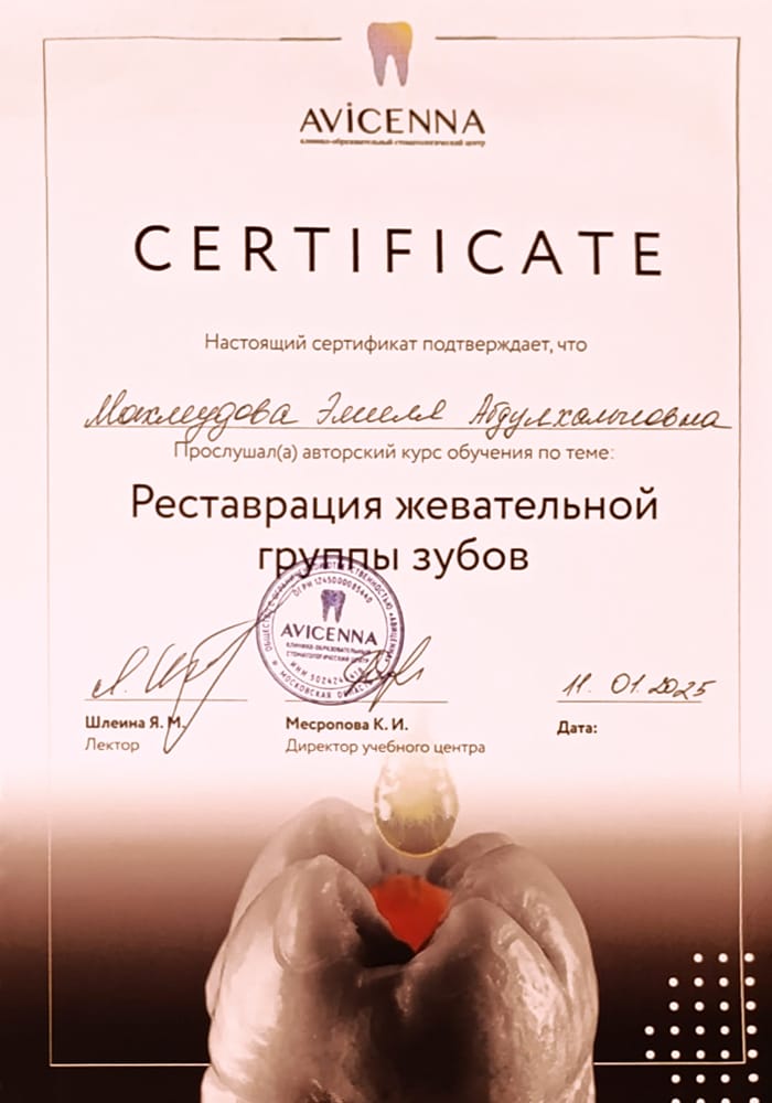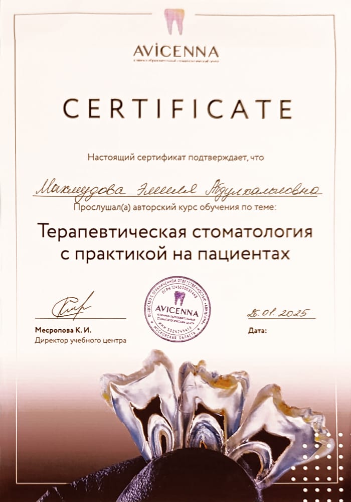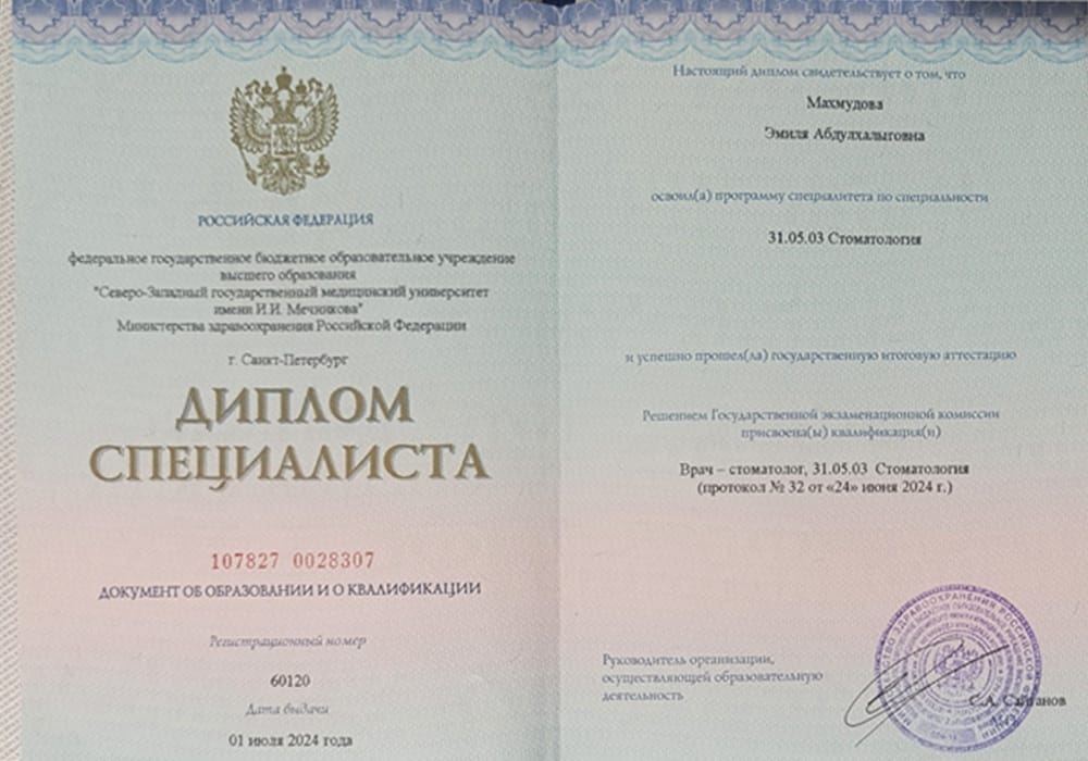 2024 г. – Окончила Северо-Западный государственный медицинский университет имени И.И.Мечникова по специальности «Стоматология».