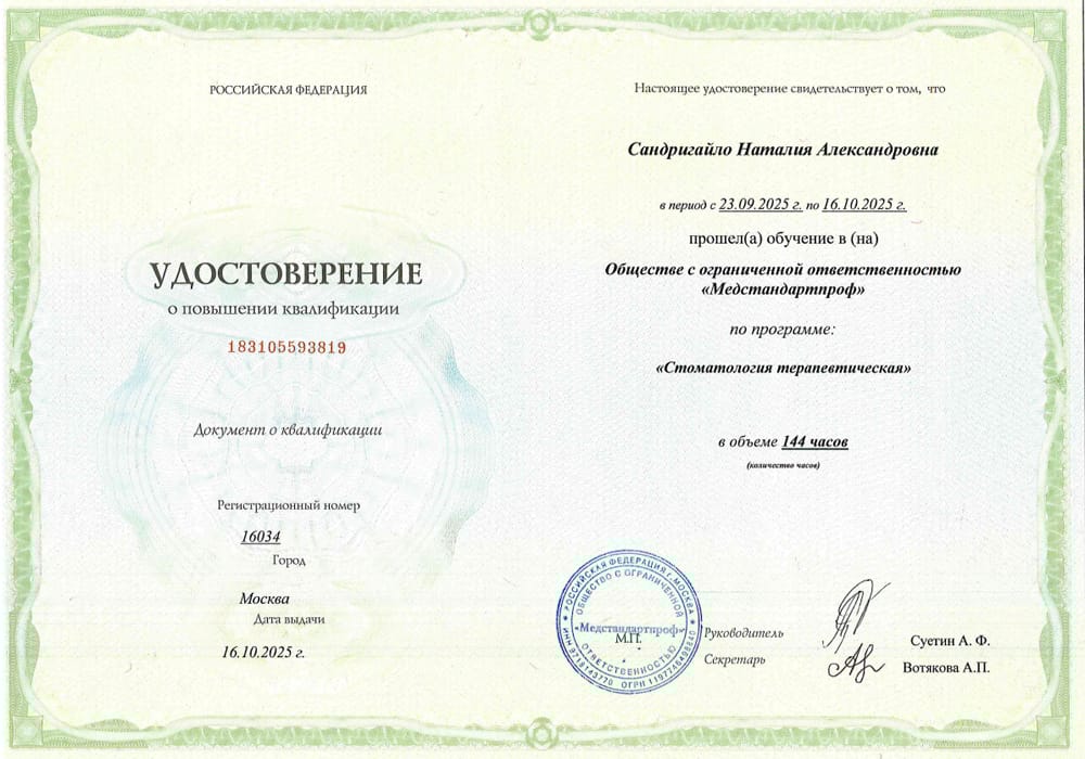 2025 г. - Повышение квалификации в Медстандартпроф по специальности «Стоматология терапевтическая».
