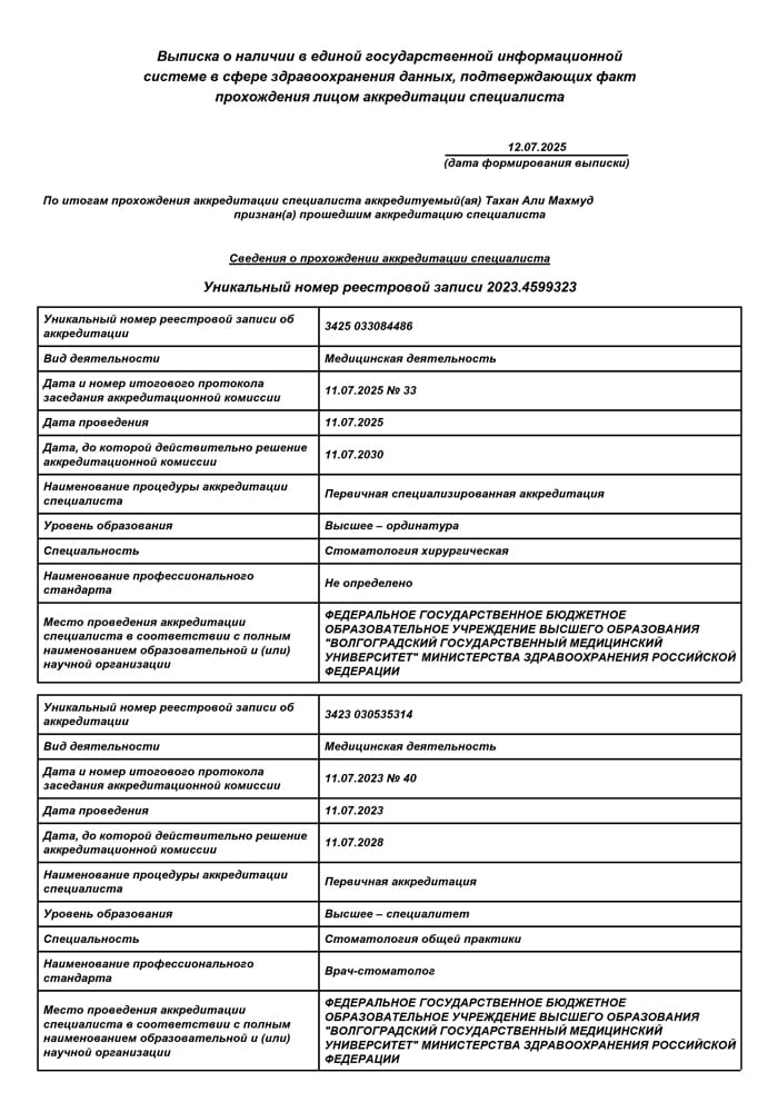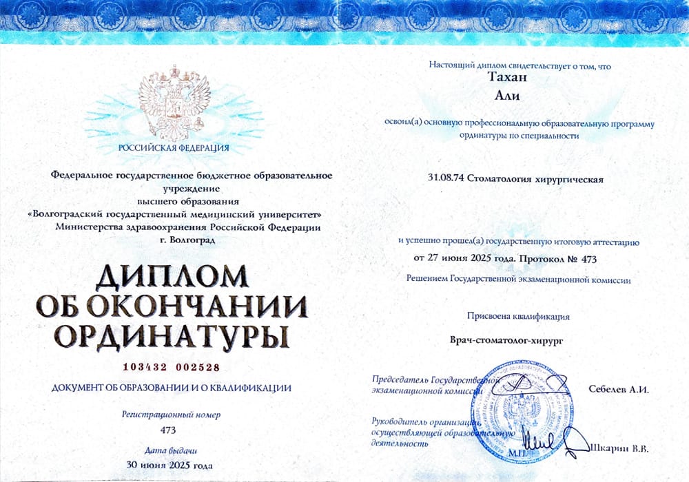 2025 г. - Ординатура в Волгоградском государственном медицинском университете по специальности «Стоматология хирургическая».