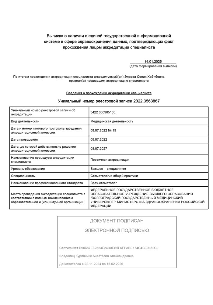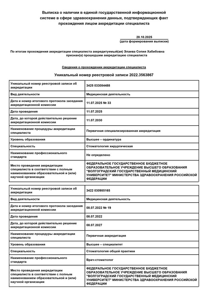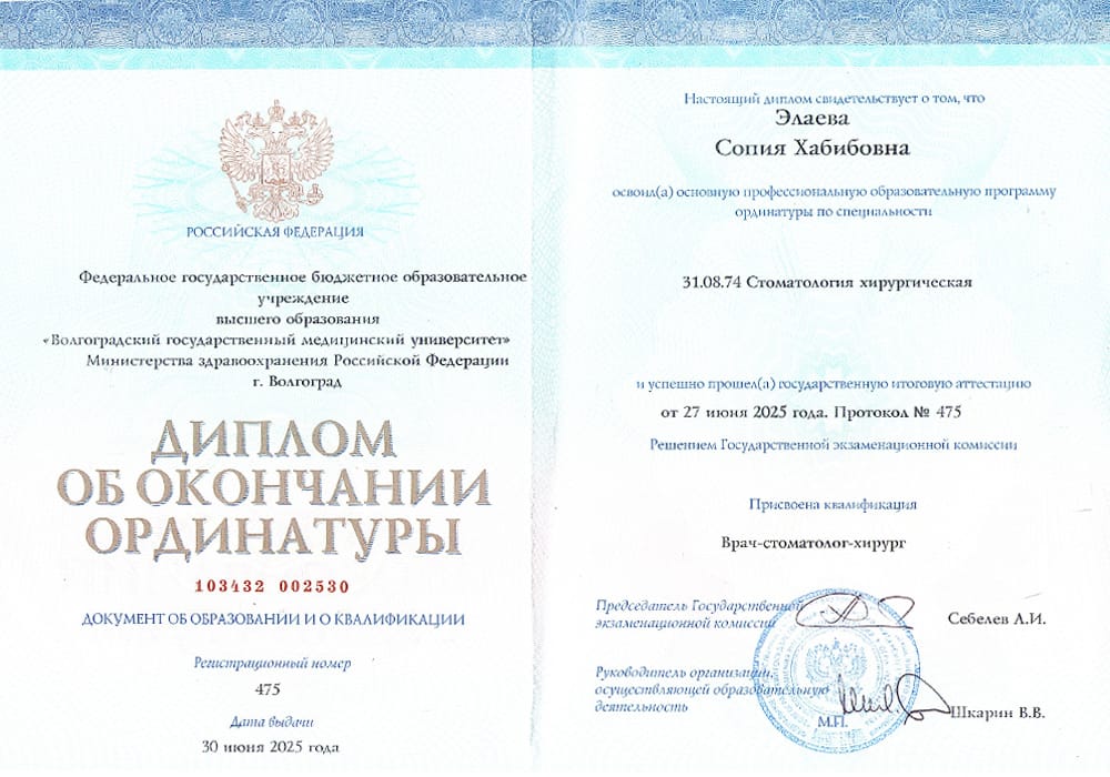 2025г. - Волгоградский государственный медицинский университет. Ординатура, специальность – стоматология хирургическая.