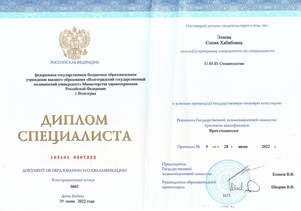 2022г. - Волгоградский государственный медицинский университет. Факультет – стоматология.