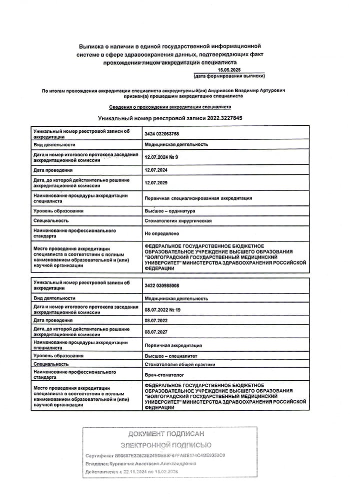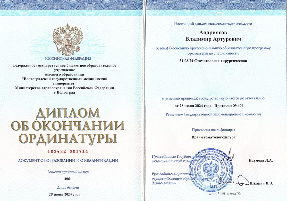 2024 г. - Ординатура в Волгоградском государственном медицинском университете по специальности «Стоматология хирургическая».