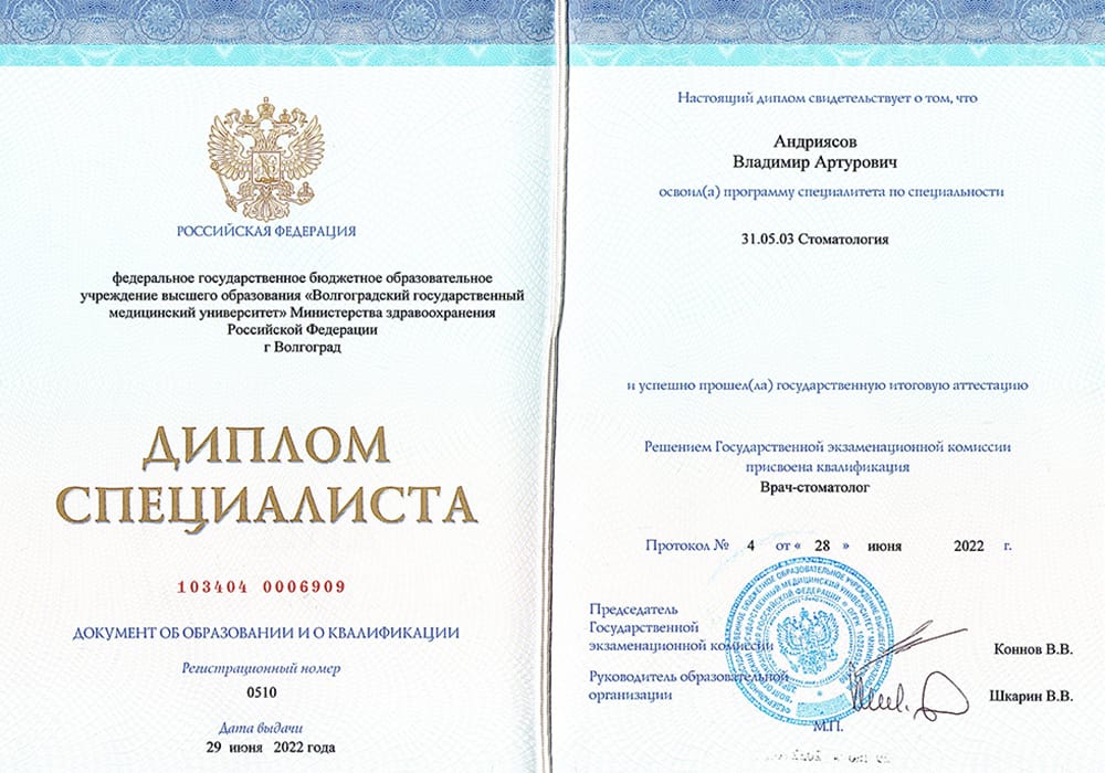 2019 г. - Окончил Волгоградский государственный медицинский университет по специальности «Стоматологии».