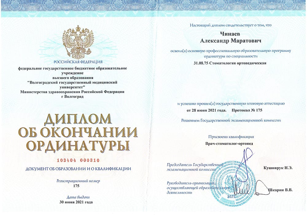 2021 г. - Ординатура в Волгоградском государственном медицинском университете по специальности «Стоматология ортопедическая».