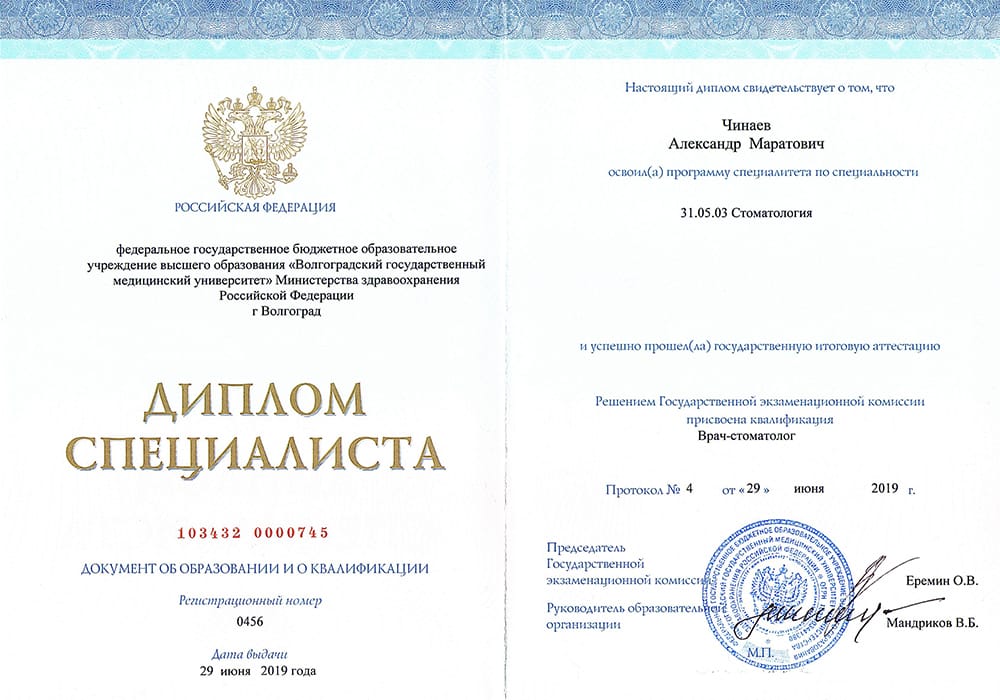 2019 г. - Окончил Волгоградский государственный медицинский университет по специальности «Стоматологии».